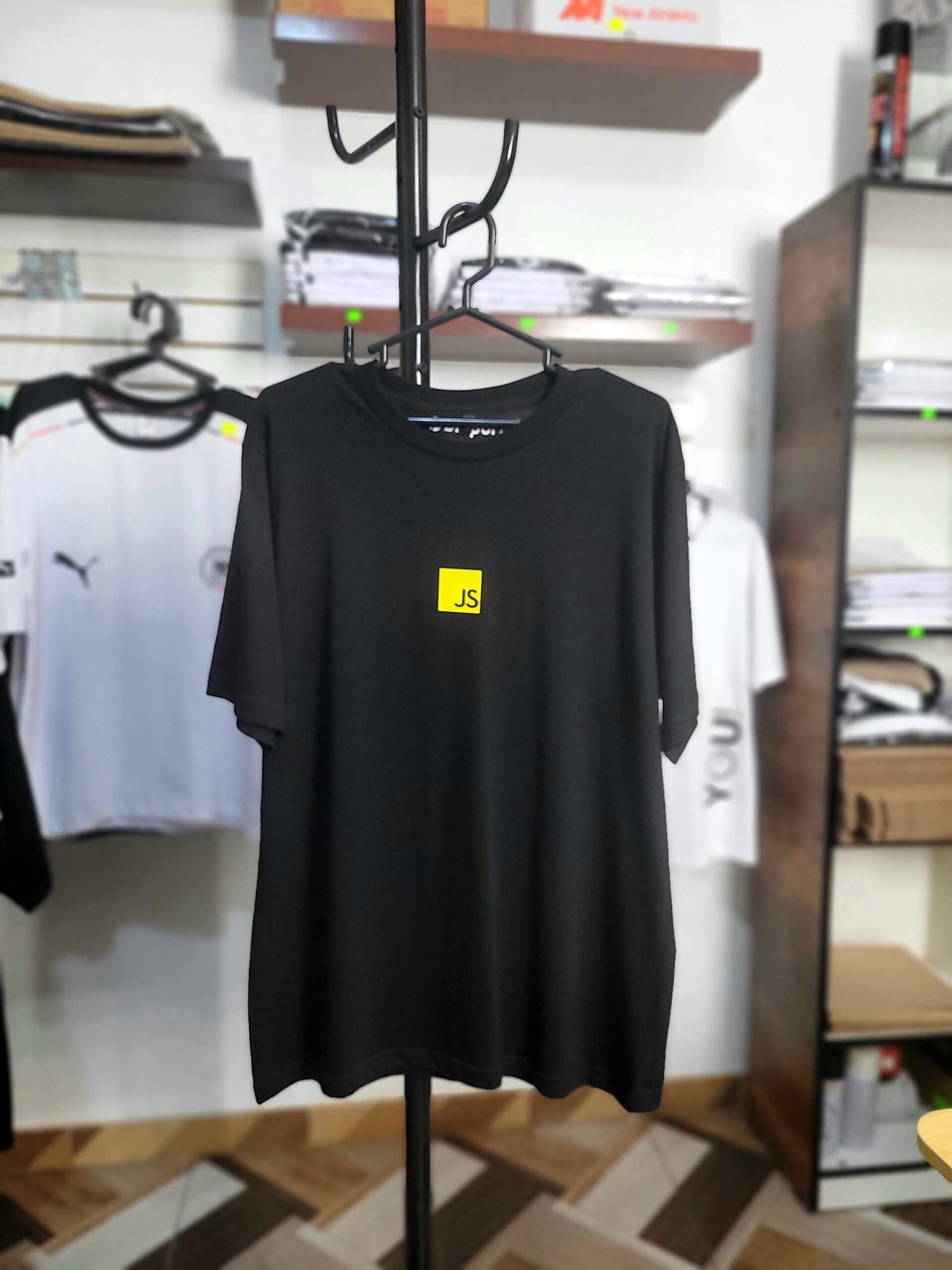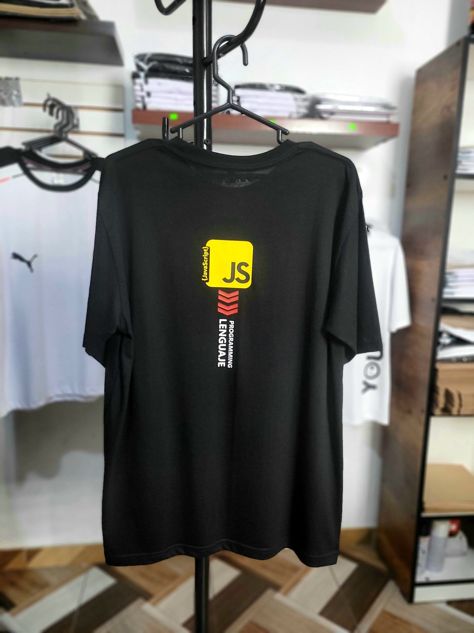 Su color negro clásico, junto al logo JS estampado al frente y la parte de atras, ofrece un look moderno, limpio y profesional, perfecto para quienes quieren vestir su identidad como desarrolladores.